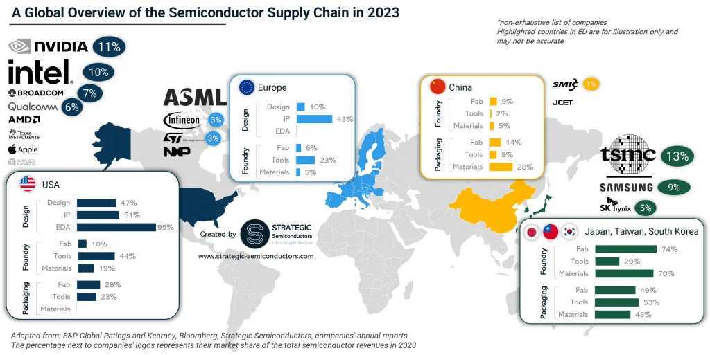 Today, Asia accounts for over 75% of the global semiconductor fab capacity, with an even higher market share of 90% in chip assembly and testing. This includes countries like China, Taiwan and South Korea.