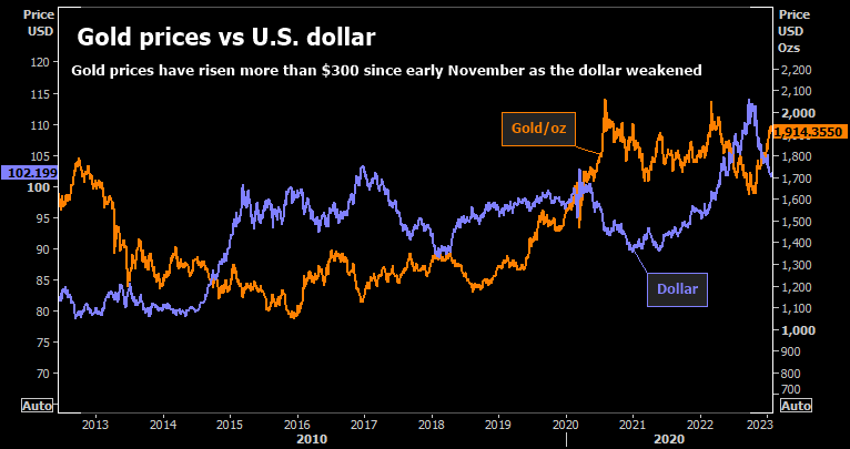The value of the U.S. dollar and gold prices have an inverse relationship, meaning that when the dollar weakens, gold prices tend to rise, and vice versa. This occurs because gold is priced in dollars; therefore, a weaker dollar makes gold less expensive for buyers using other currencies. As a result, foreign demand for gold increases, driving its price up.